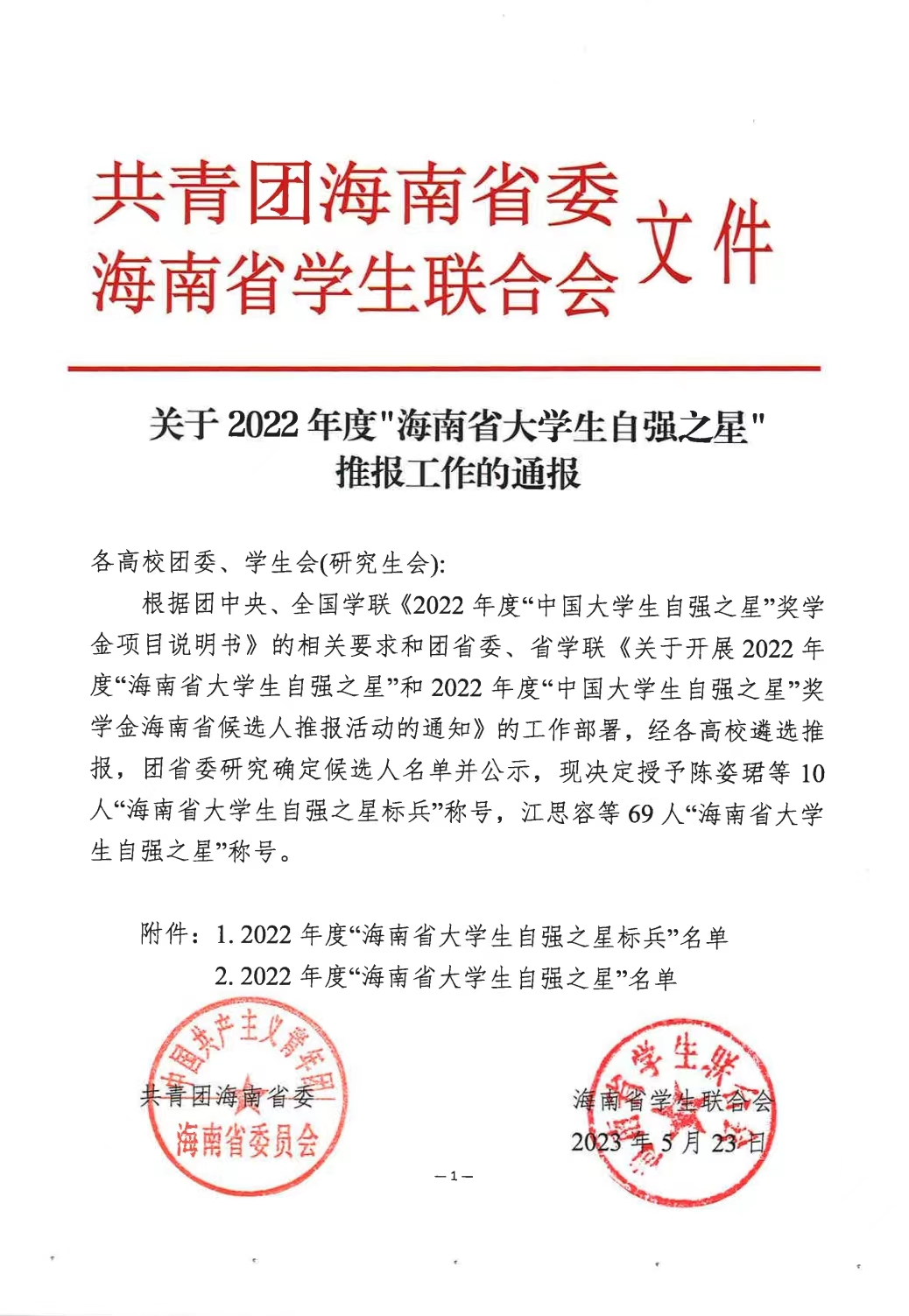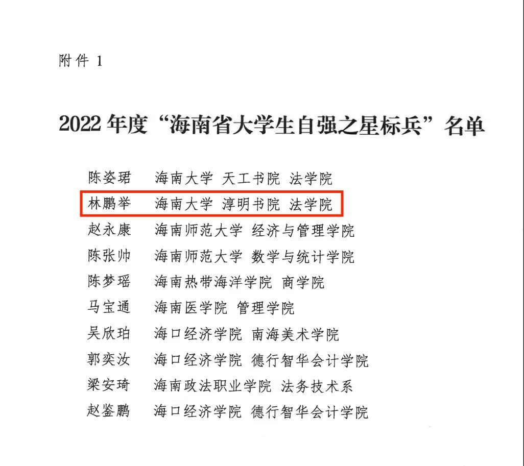 近日,由共青团海南省委、海南省学生联合会公布了2022年度“中国大学生自强之星标兵”和2022年度“中国大学生自强之星”名单,yl7703永利青年学子林鹏举荣获2022年度“海南省大学生自强之星标兵”称号。