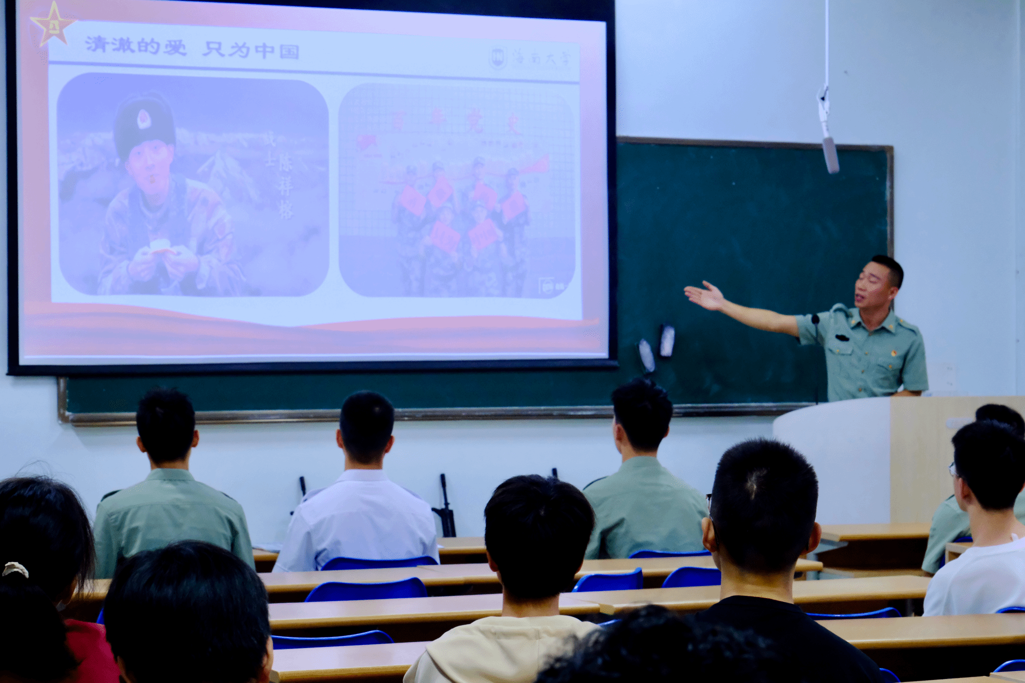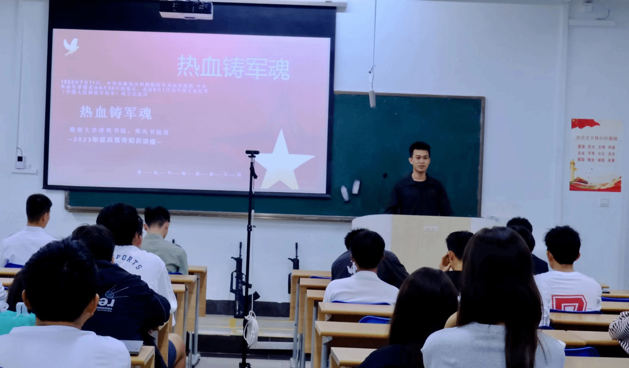 从戎报国志,青春正当时。为进一步加强国防教育,加大征兵宣传力度,普及征兵政策,鼓励海大学子响应国家号召积极应征入伍,12月8日晚,我院与乘风书院联合在五教110教室开展征兵宣讲活动。退伍大学生罗木生、蒋奇峰、张恩泽、符首创、陈善炜、叶京安担任宣讲嘉宾,来自两个书院的有意参军学生参会。