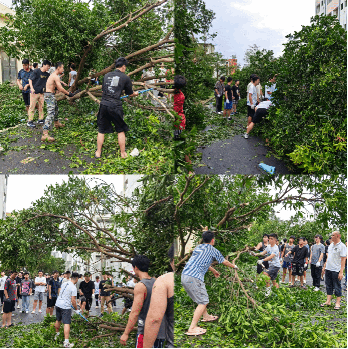 灾情就是命令,面对前所未有的风雨考验,海大人齐心协力,共克时艰,全力投入灾后恢复重建工作。yl7703永利青年先锋突击队分成若干小组,他们听从统一指令,分工合作,互帮互助,有的清理倾倒的树木、有的清扫吹落的杂物、有的规整电动车,即使中途下起大雨,雨水打在脸上,衣服早已浸透,但是他们也毫不退缩,依然情绪高涨,整整4个小时的时间,清理搬运了10余棵大树,规整了上百辆电动车等,疏通了书院至五食堂的主干道。他们用实际行动汇聚起重建美丽家园的坚强力量,展现了淳明学子的热血与担当。
