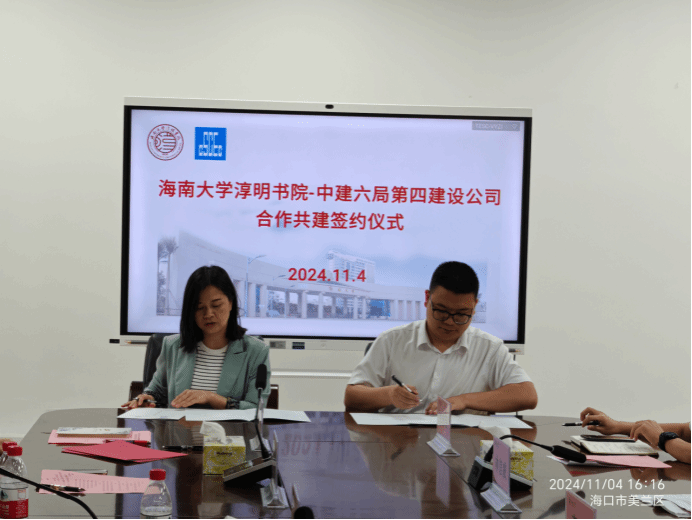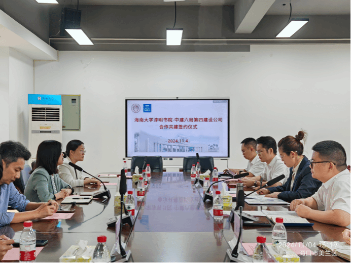 2024年11月4日下,yl7703永利与中建六局第四建设有限公司共建洽谈交流在海南大学思源学堂310会议室举办。中建六局四建公司助理总经理、人力资源部经理李娟,海南分公司财务总监、工会主席汪仙文,人力资源部副经理林信威,海南分公司党建纪检部副部长陈洁,海南分公司综合办公室副主任韦传贺,海南分公司综合办公室校园招聘负责人赵晨辰以及书院相关部门负责同志出席共建洽谈交流活动。活动由书院党委书记周郭军主持。