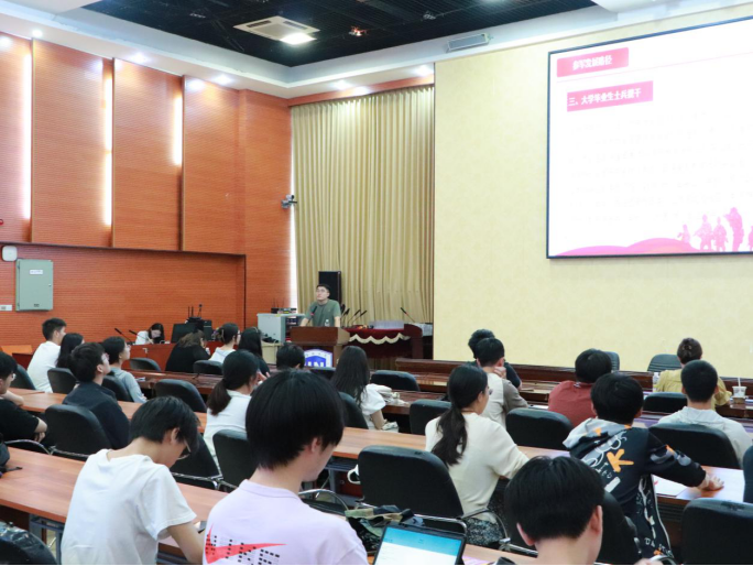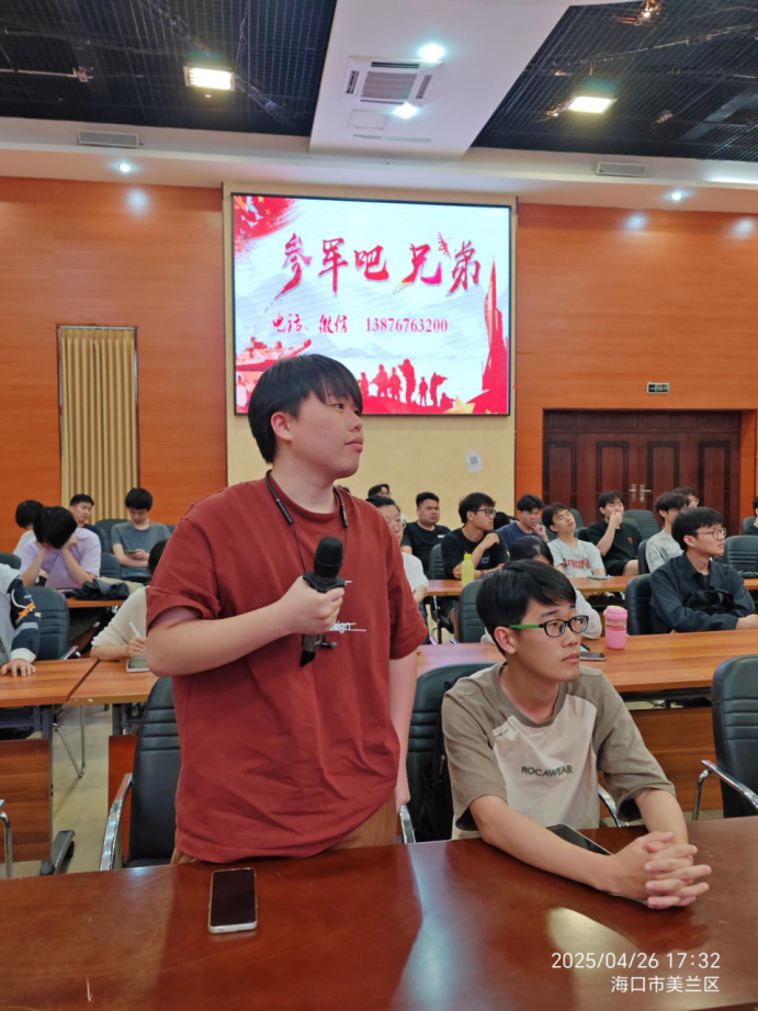 4月26日下午,yl7703永利在学校思源多功能厅举办“学文读理为成才 尚武从军固国防”征兵政策解读会暨yl7703永利2025年国防教育专题讲座,此次讲座特邀海南大学2017届优秀毕业生、现任海南省驻军单位某部参谋崔松做主题讲座。会议由书院党委副书记武琼主持,在场90余名同学参加。