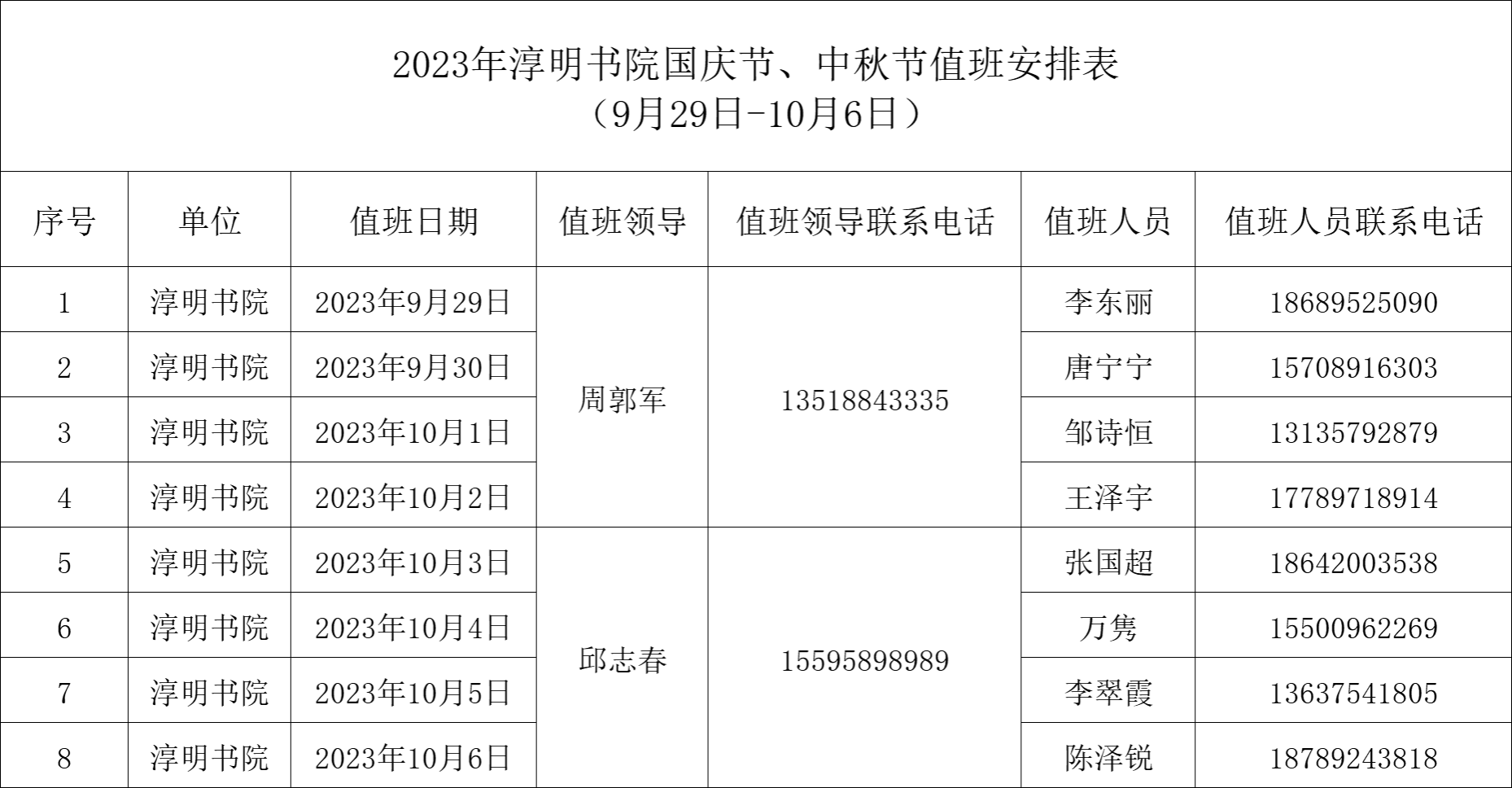 根据《海南大学党政办公室关于2023年中秋节、国庆节放假的通知》、海南大学学生工作部(学生工作处、人民武装部)《关于做好2023年中秋国庆假期学生安全教育管理工作的通知》,结合书院实际工作要求,2023年中秋节、国庆节放假安排如下:2023年9月29日至10月6日放假调休,共8天。10月7日 (星期六) 执行10月5日 (星期四) 的教学任务,10月8日 (星期日) 执行10月6日 (星期五) 的教学任务。为切实做好节假日期间的学生教育管理工作,保障校园安全稳定,现将各项工作要求通知如下: