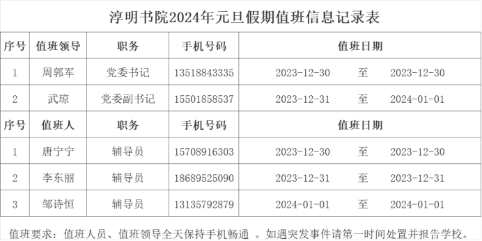 值班领导和值班辅导员老师须保持24小时通讯畅通,如同学们遇突发事件,请第一时间联系辅导员。