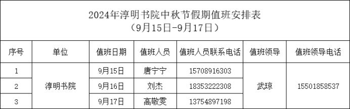 根据海南大学党政办公室《关于2024年中秋节放假的通知》,2024年中秋节放假安排如下:2024年9月15日至17日放假调休,共3天。9月14日(星期六)正常教学活动。9月14日(星期六)执行9月16日(星期一)的教学任务。为切实做好节假日期间的学生教育管理工作,保障校园安全稳定,现将各项工作要求通知如下: