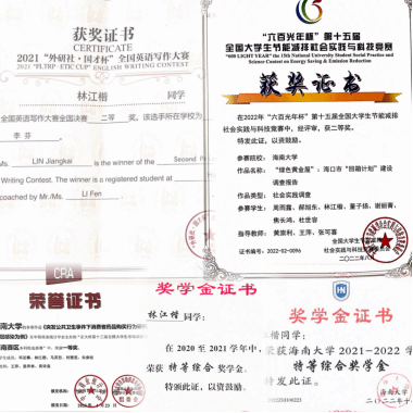 在经济全球化背景之下,他深知跨文化交际能力的重要性,因此他注重自身英语能力的培养,考取大学英语四六级600+分、雅思8分,并开创学院首例,斩获外研社英文写作大赛省特等奖,随后晋级全国总决赛,与来自五湖四海的上百名选手比拼。在赛程中,他致力用外语书写中国故事、叙述中华传统文化,最后成功跻身全国20强。此外,他始终怀揣着丈量世界的梦想,因此推免北京大学涉外项目攻读硕士学位,以期用专业技能和跨文化能力,为社会发展贡献绵薄之力。
