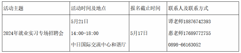 为满足毕业生的职业发展及用人单位的招才引智需求,促进我院2024届毕业生更加充分、更高质量就业,海南大学国际商学院、淳明、天工、南海、凤翔书院拟定于5月21日在海甸校区举办“2024年就业实习专场招聘会”,诚挚邀请各行业用人单位莅临海南大学,广纳贤才!感谢各用人单位的关心和支持!相关事项说明如下: