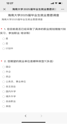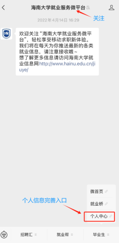 (2)微信端:关注公众号“海南大学就业服务微平台” - 个人中心 - 系统登录 - 问卷调查 - 个人信息完善确认。