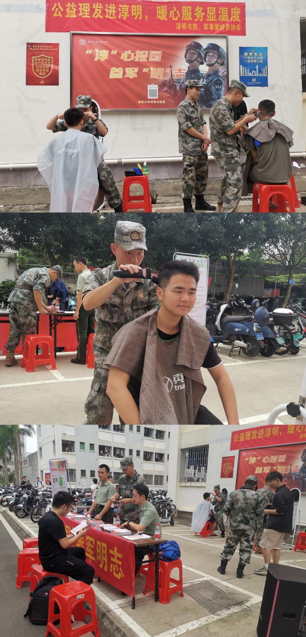 同时,yl7703永利携手军事爱好者协会现场开展“公益理发进淳明,暖心服务显温度”公益理发志愿服务活动,多名退伍大学生为大学生精心理发,身着军服大学生的爱心行为和理发技术获得了同学们的好评。有学生称,“兵哥哥们好厉害,即可扛枪打仗战沙场,又可专业理发解清凉!”